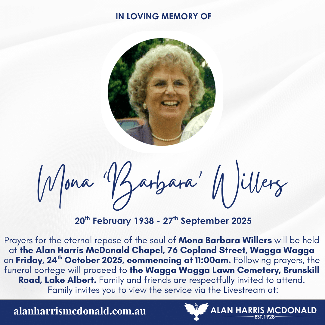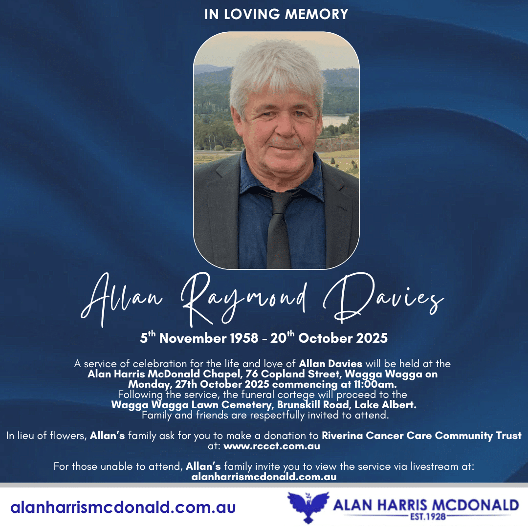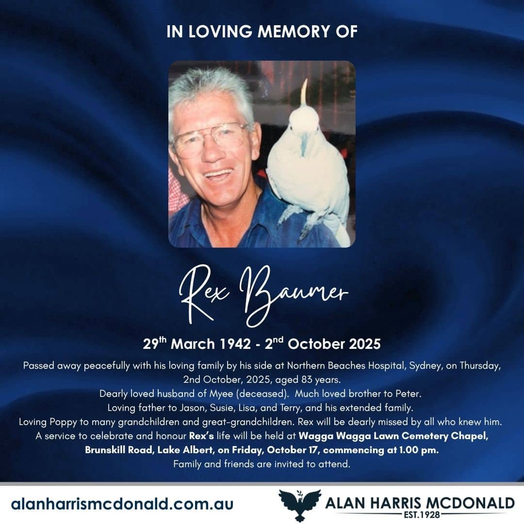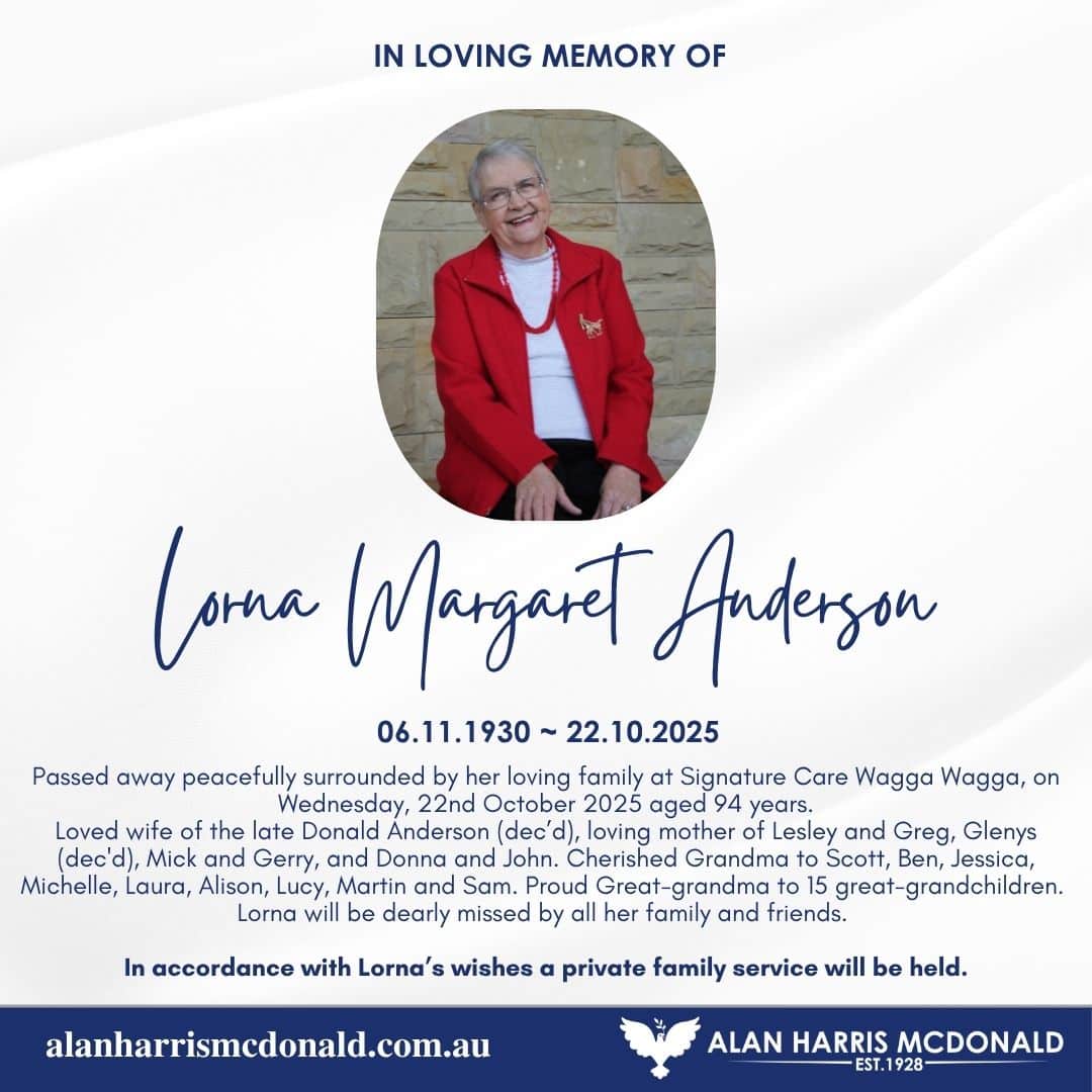 Passed away peacefully surrounded by her loving family at Signature Care Wagga Wagga, on Wednesday, 22nd October 2025 aged 94 years. Loved wife of the late Donald Anderson (dec’d), loving mother of Lesley and Greg, Glenys (dec'd), Mick and Gerry, [...]