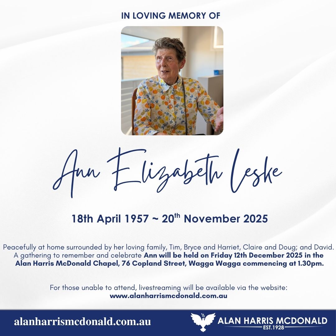 Peacefully at home surrounded by her loving family, Tim, Bryce and Harriet, Claire and Doug; and David. A gathering to remember and celebrate Ann will be held on Friday 12th December 2025 in the Alan Harris McDonald Chapel, 76 Copland [...]