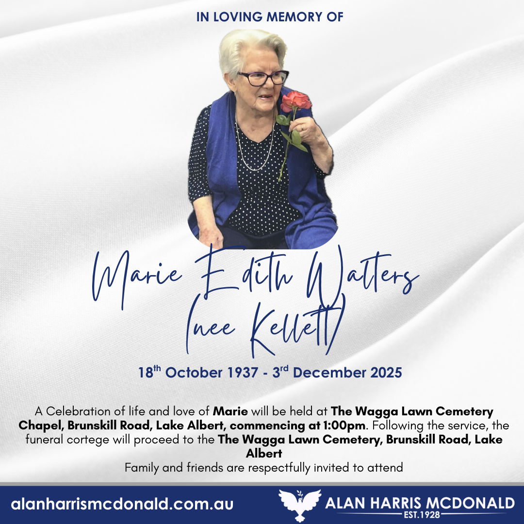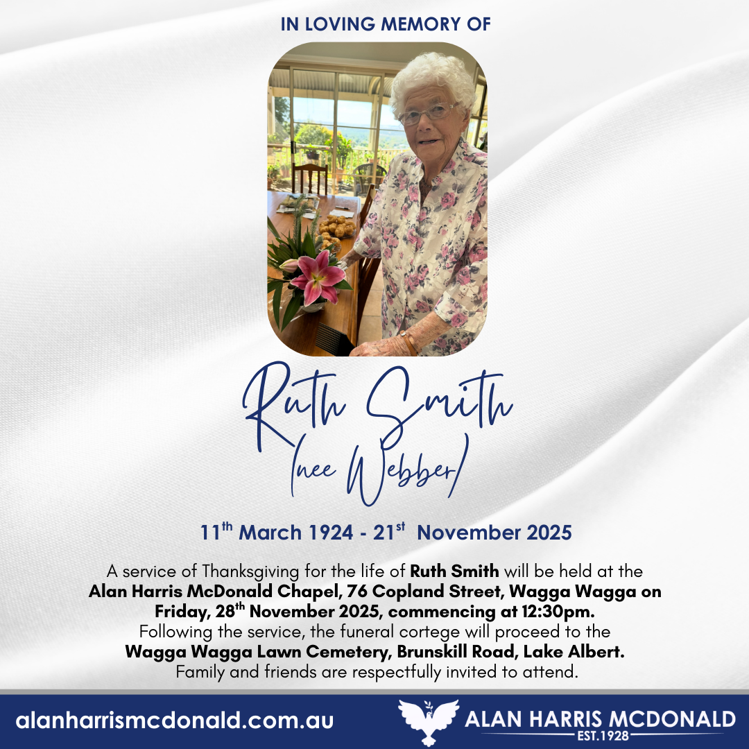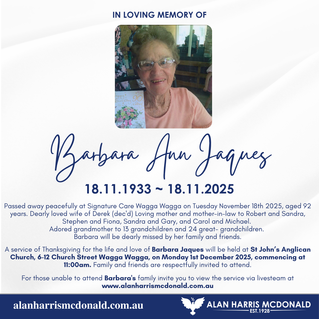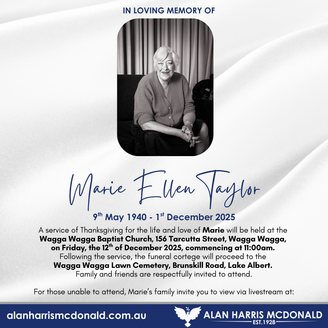 Passed away peacefully at Signature Care Wagga Wagga on Tuesday November 18th 2025, aged 92 years. Dearly loved wife of Derek (dec'd) Loving mother and mother-in-law to Robert and Sandra, Stephen and Fiona, Sandra and Gary, and Carol and Michael. [...]