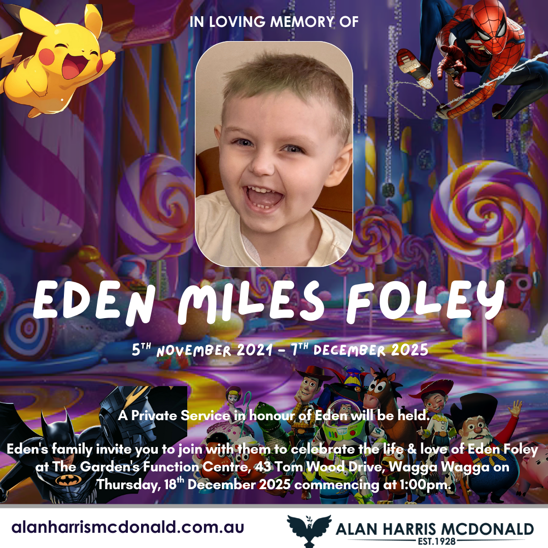 A Private Service in honour of Eden will be held. Eden's family invite you to join with them to celebrate the life & love of Eden Foley at The Garden's Function Centre, 43 Tom Wood Drive, Wagga Wagga on Thursday, [...]