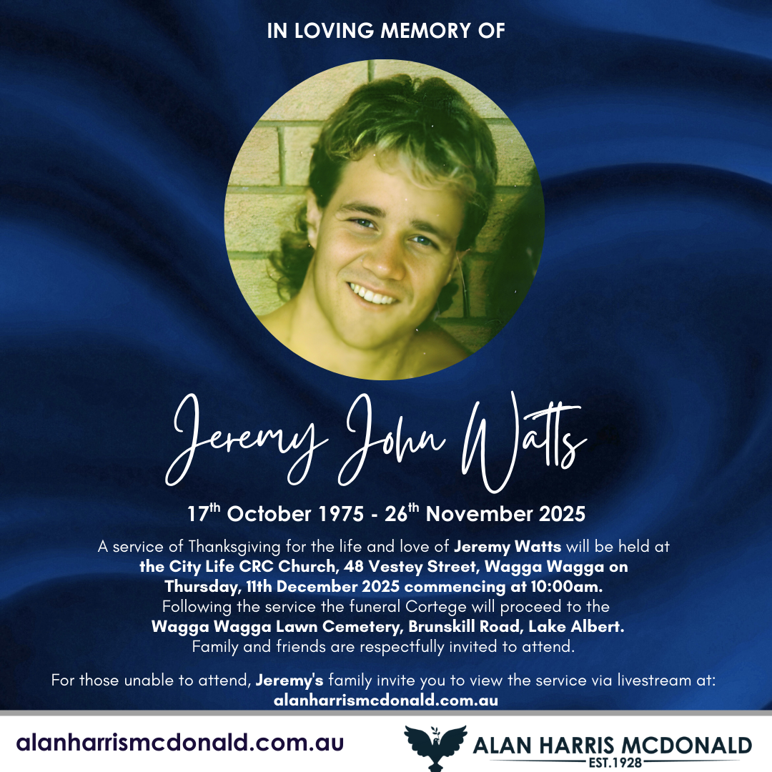 Passed away peacefully on Wednesday, 26th November 2025, aged 50 years. Beloved son of Jenny and Gary (dec'd). Loving father of Angel, Noah, Kye, Matt and Bonnie. Much loved brother and brother-in-law of Kyle, Bridie & Kris, Jacob & Ally. [...]