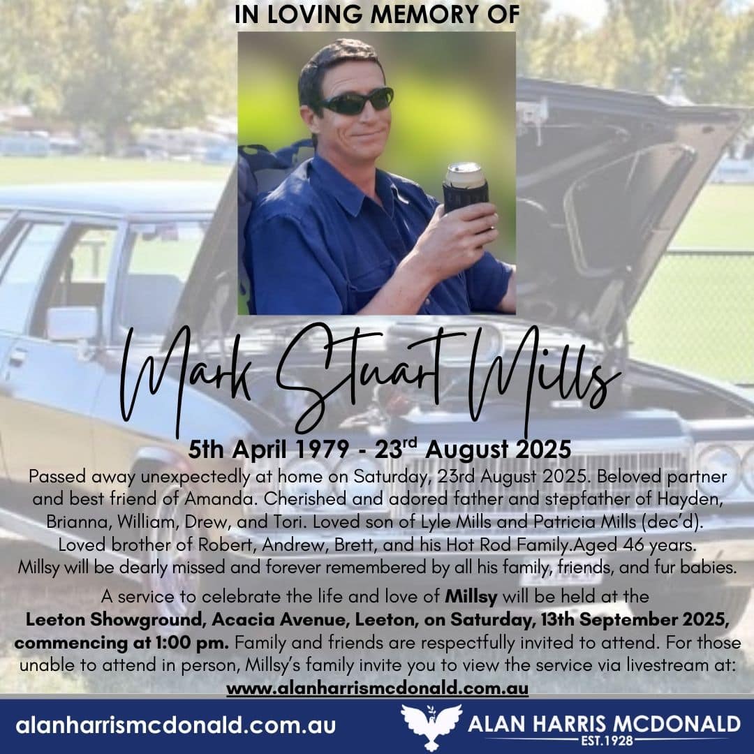 A service to celebrate the life and love of Millsy will be held at the Leeton Showground, Acacia Avenue, Leeton, on Saturday, 13th September 2025, commencing at 1:00 pm. Family and friends are respectfully invited to attend. For those unable to attend in person, Millsy’s family invite you to view the service via livestream at: www.alanharrismcdonald.com.au
