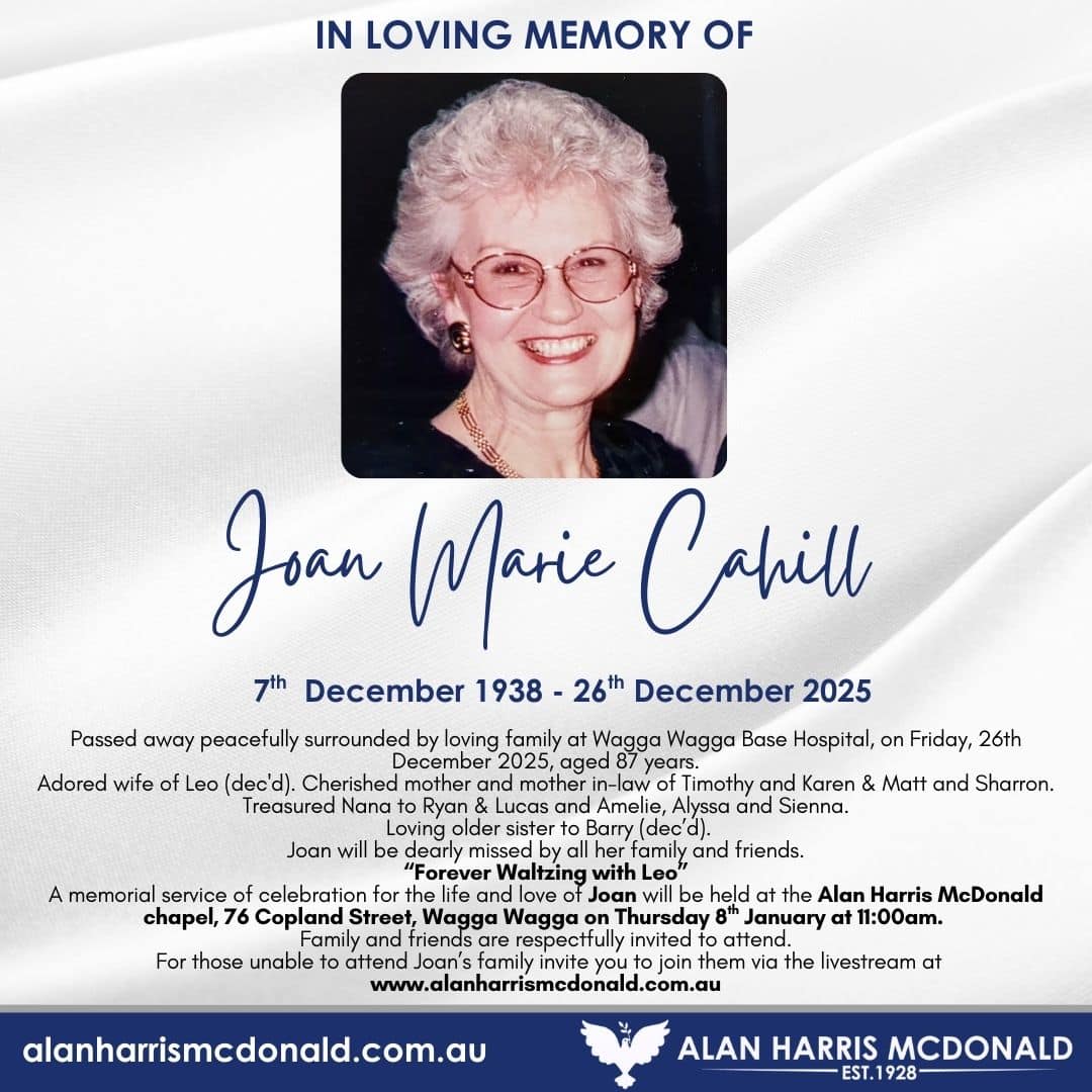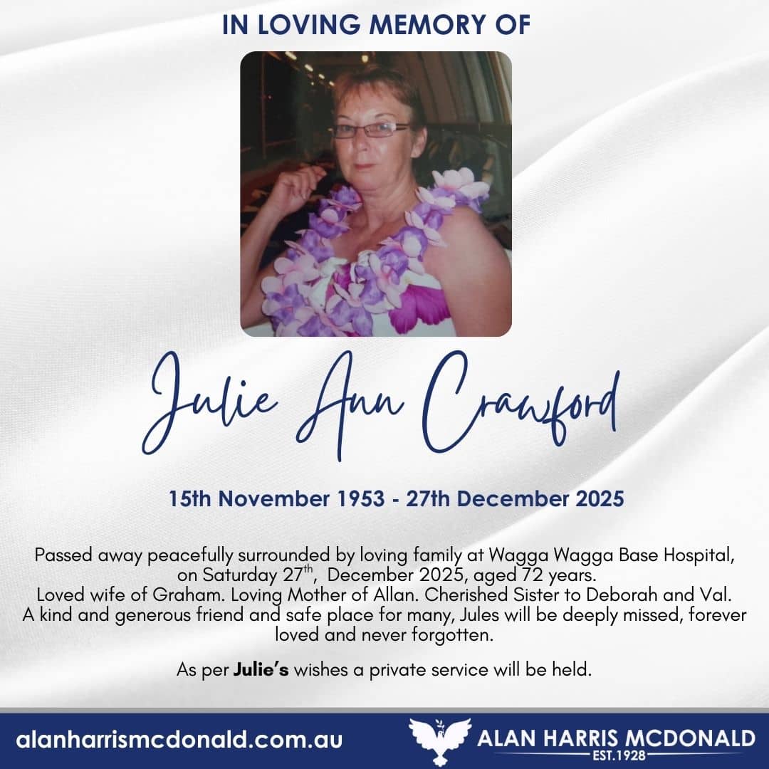Passed away peacefully surrounded by loving family at Wagga Wagga Base Hospital on Saturday, 27th December 2025, aged 72 years. Loved wife of Graham. Loving Mother of Allan. Cherished Sister to John (dec'd), Cliff (dec'd), Valerie, Colleen (dec'd), and Deborah. [...]