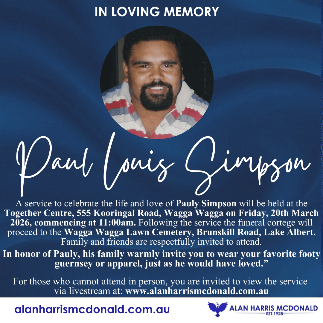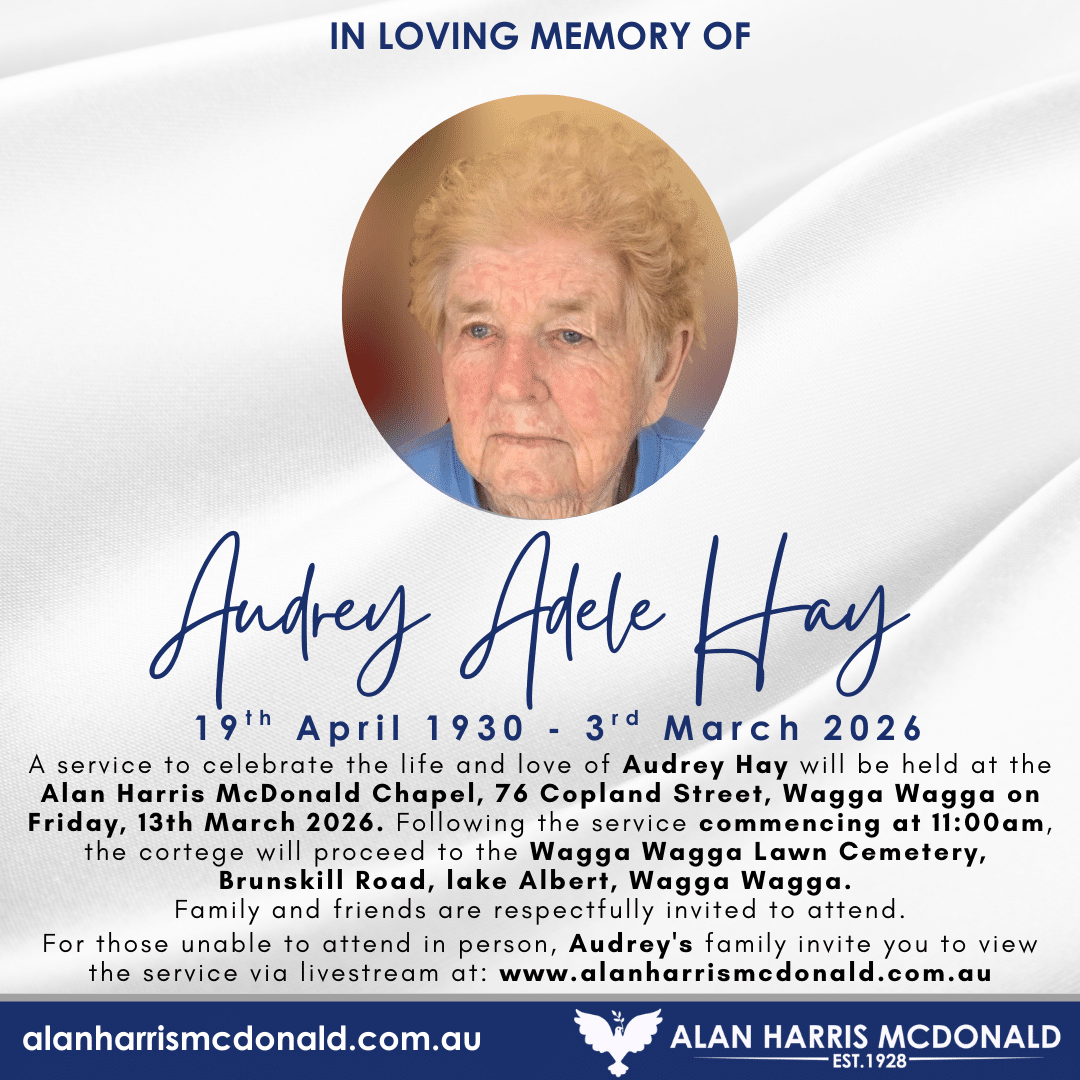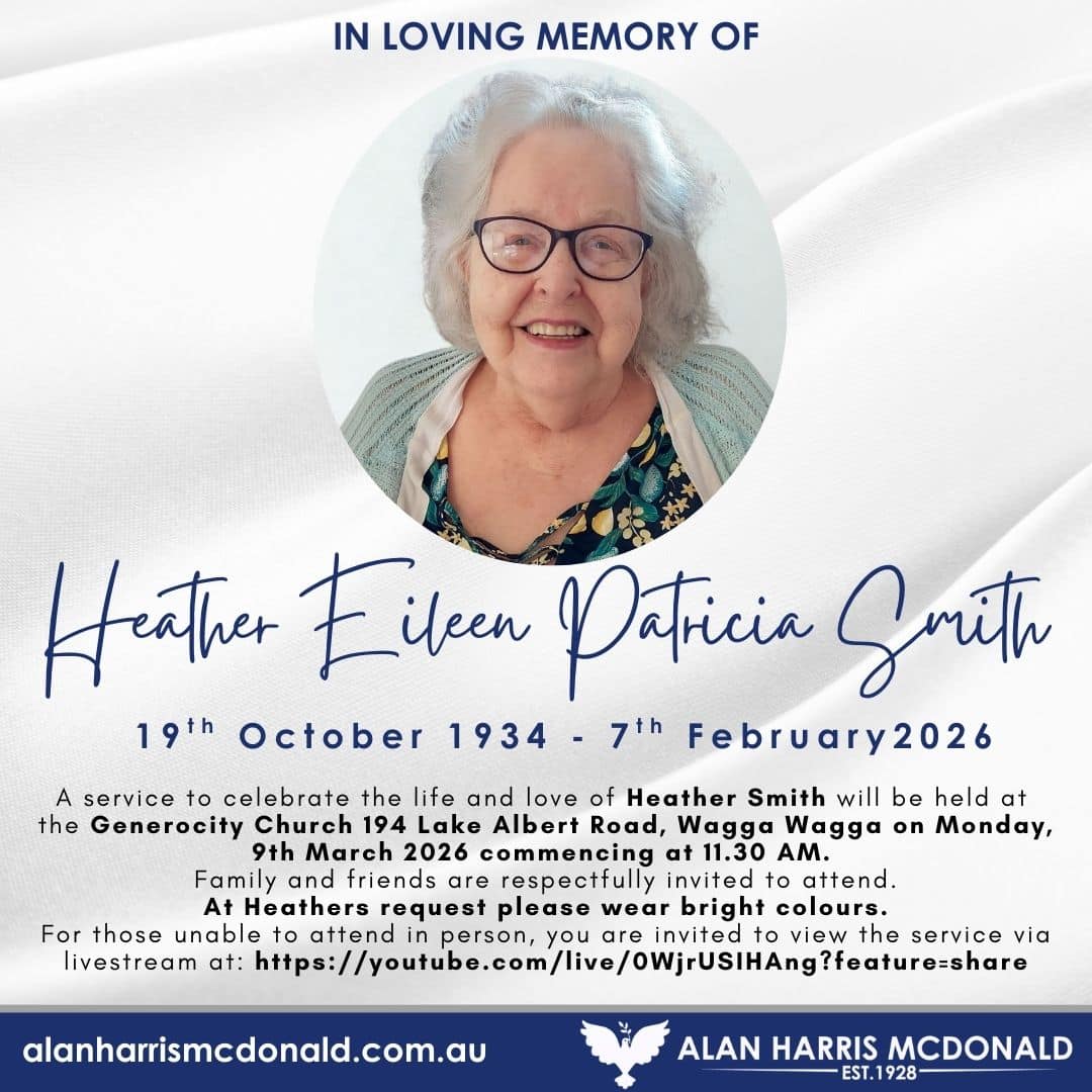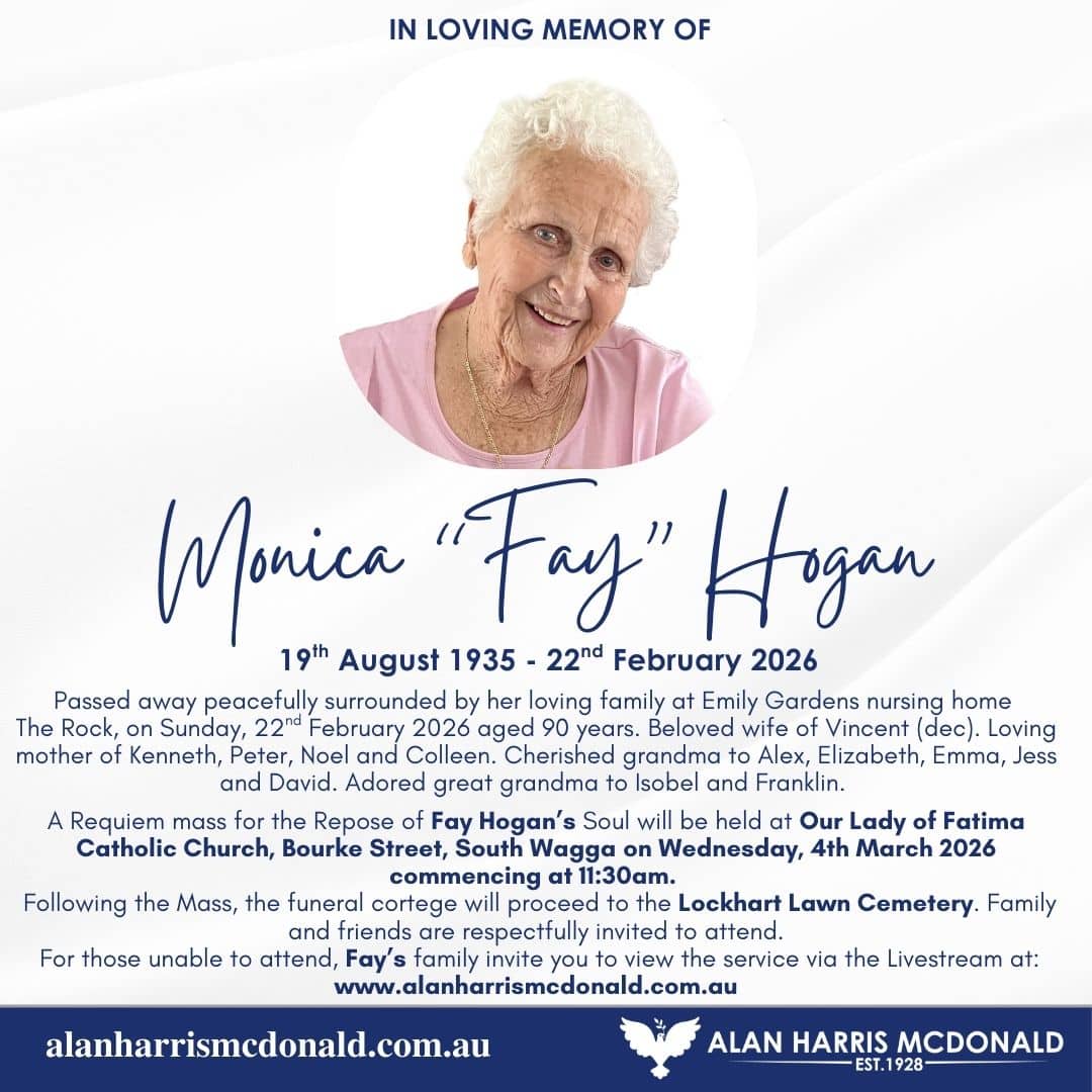 Passed away peacefully at Emily Gardens, The Rock on Sunday, 1st March 2026. Devoted mother of her daughters and sons, grandchildren and great-grandchildren. "May the road rise to meet you, May the wind be always at your back. May the [...]