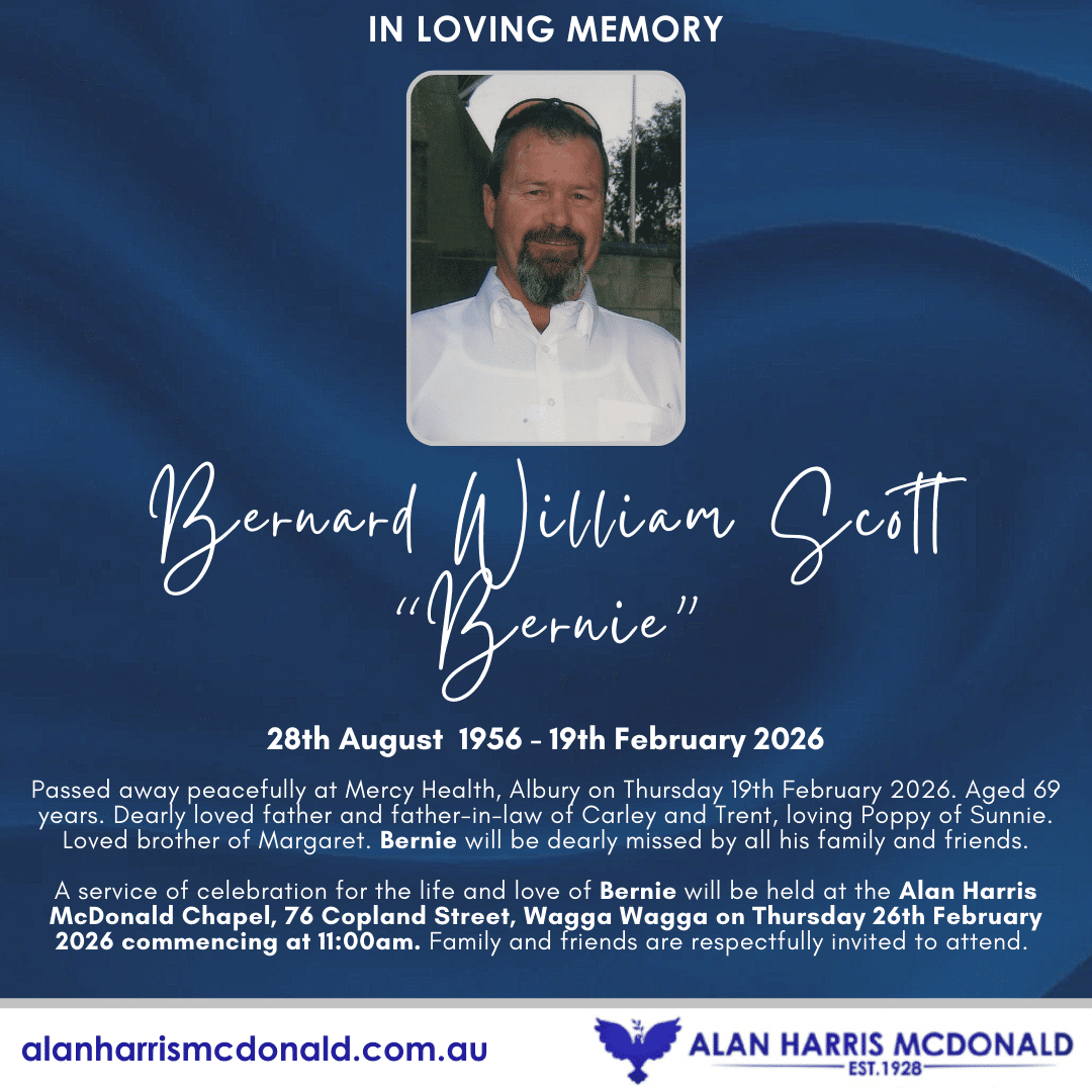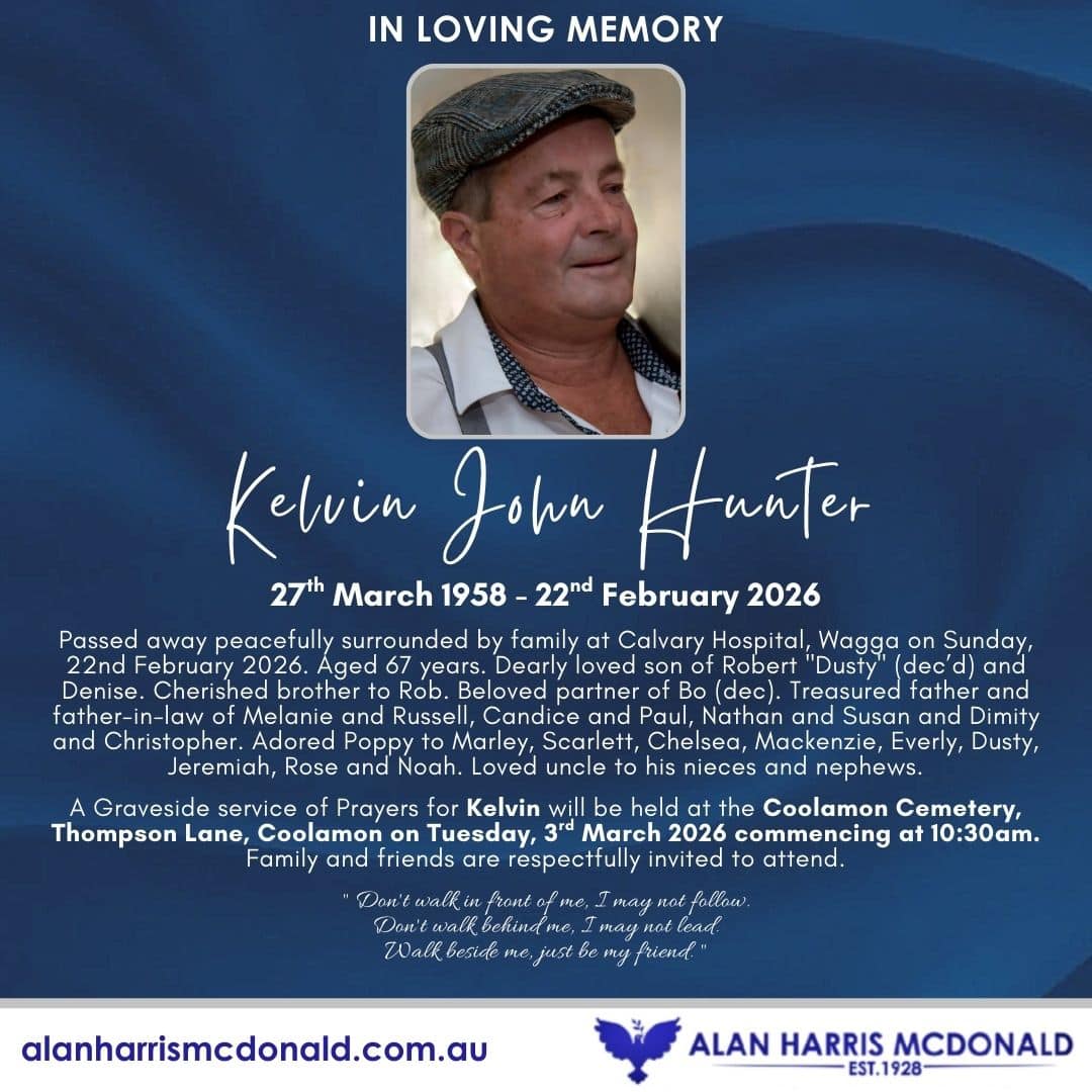 Passed away peacefully surrounded by family at Calvary Hospital, wagga on Sunday, 22nd February 2026. Aged 67 years. Dearly loved son of Robert "Dusty" (dec’d) and Denise. Cherished brother to Rob. Beloved partner of Bo (dec). Treasured father and father-in-law [...]
