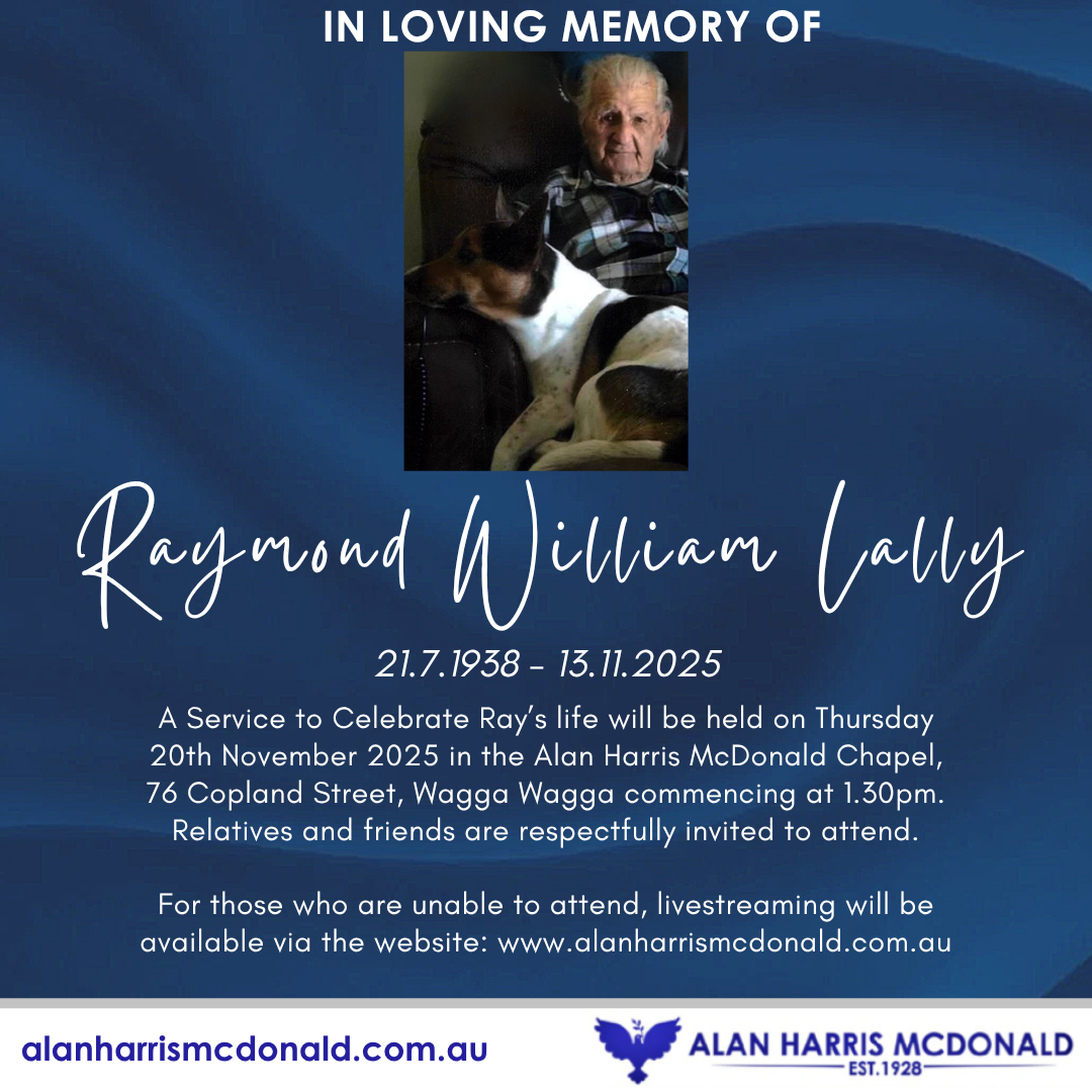 A Service to Celebrate Ray’s life will be held on Thursday 20th November 2025 in the Alan Harris McDonald Chapel, 76 Copland Street, Wagga Wagga commencing at 1.30pm. Relatives and friends are respectfully invited to attend.