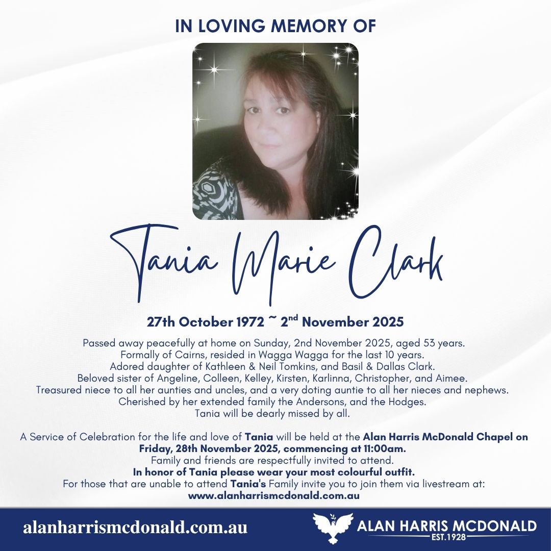 A Service of Celebration for the life and love of Tania will be held at the Alan Harris McDonald Chapel on Friday, 28th November 2025, commencing at 11:00am.