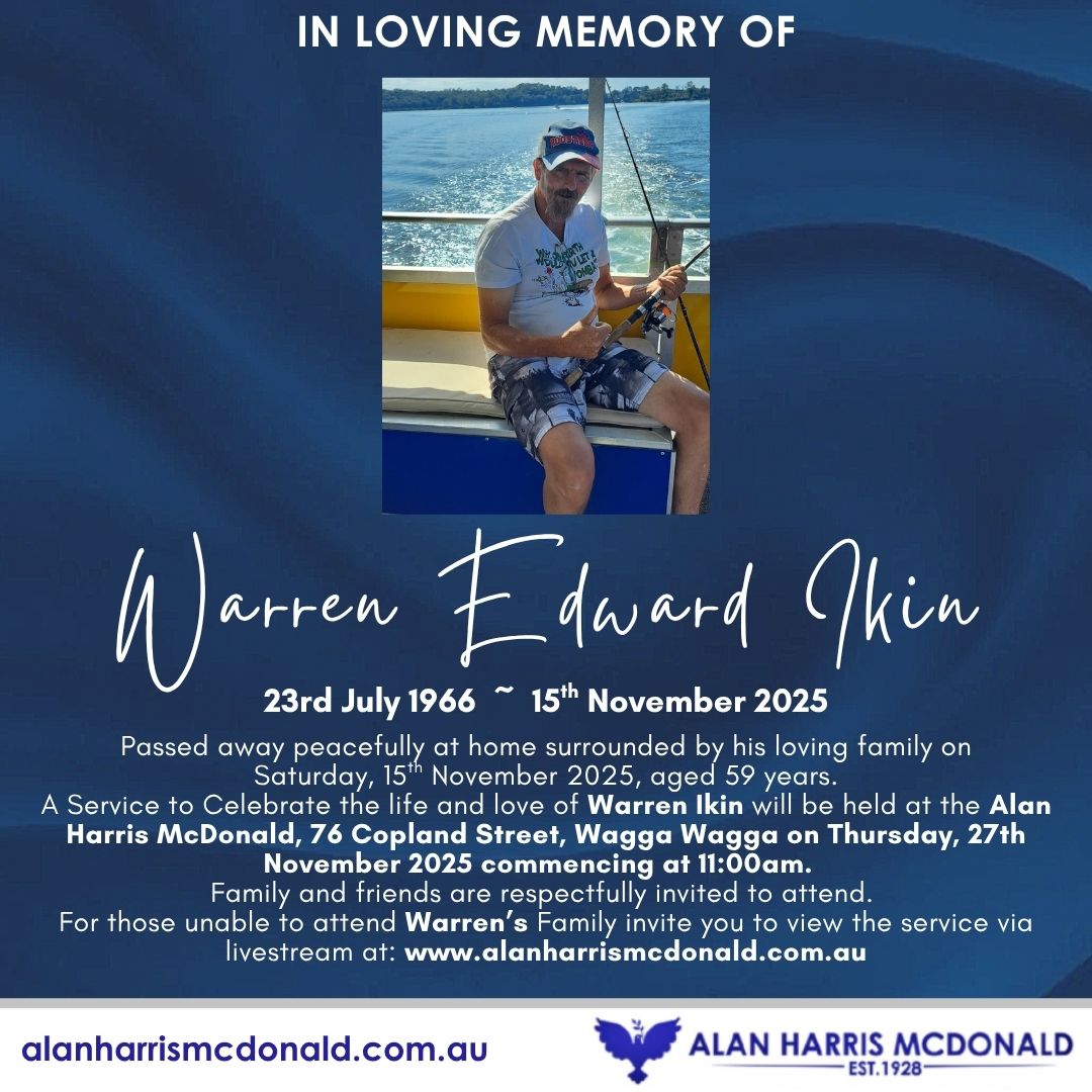 A Service to Celebrate the life and love of Warren Ikin will be held at the Alan Harris McDonald, 76 Copland Street, Wagga Wagga on Thursday, 27th November 2025 commencing at 11:00am.